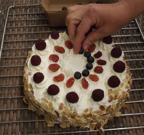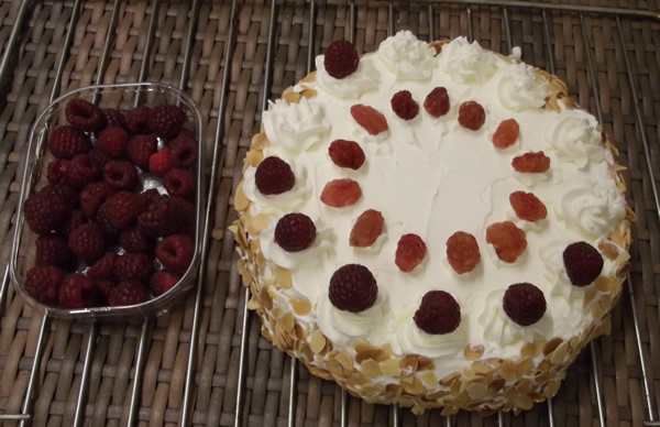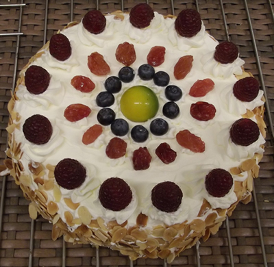 Amandes éffilées avec décor de framboises , d’abricots secs imbibés de grand Marnier